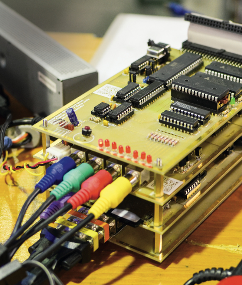 Mit zunehmender Komplexität und spätestens mit dem Hinzukommen des Videochips TMS9929, der einigen noch aus den MSX-1-Rechnern oder dem TI99/4a bekannt sein dürfte, wurde es immer schwieriger, zwischen tatsächlichen Bugs im Code und Wackelkontakten auf dem Steckbrett zu unterscheiden. Daraus folgte die Entscheidung für einen Aufbau auf Platinen. Während dieser Zeit fiel auch der Begriff „Steckschwein“, zunächst als Kommentar zur Stabilität der Steckbrettaufbauten, dann als Arbeitstitel und schließlich offizieller Name des Projekts.