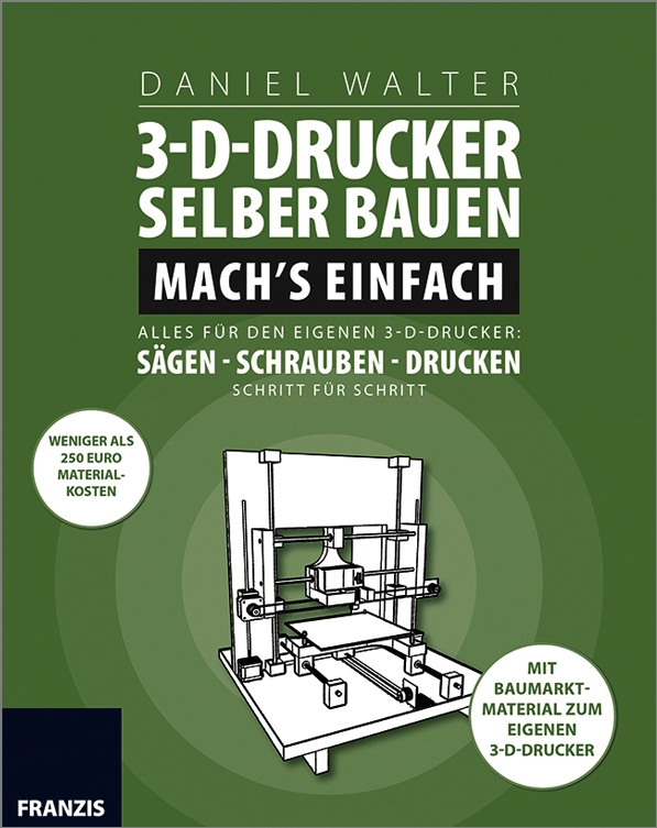 Höchstens 250 Euro an Materialkosten fallen für den 3D-Drucker an, der in diesem Buch als Selbstbauprojekt vorgestellt wird – die Differenz zu handelsüblichen 3D-Druckern wird durch den Einsatz der eigenen Zeit wettgemacht. Das Buch erläutert zuerst die Auswahl der geeigneten Bauteile. Dabei orientiert es sich an etablierten Modellen, vor allem dem Open-Source-RepRap Mendel90. Der Aufbau des Rahmens erfolgt mit stabilen Holzfaserplatten aus dem Baumarkt. Elektronik und Extruder werden vorgefertigt gekauft, wobei sinnvolle Anhaltspunkte für die Kaufentscheidung geliefert werden. Jedes Baumodul wird in einem eigenen Kapitel ausführlich behandelt, ebenso das Aufspielen der Firmware, die Einrichtung der Drucksoftware auf dem PC und das nötige Feintuning des Druckers. Vorschläge für mögliche Aufrüstungen schließen das Buch ab.