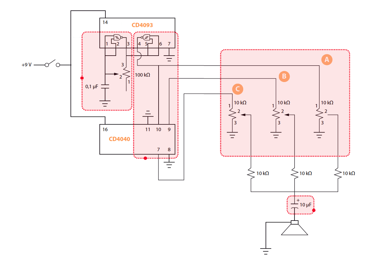 1 und 2 mit dem Ausgang 3 über ein 100-kΩ-Potenziometer