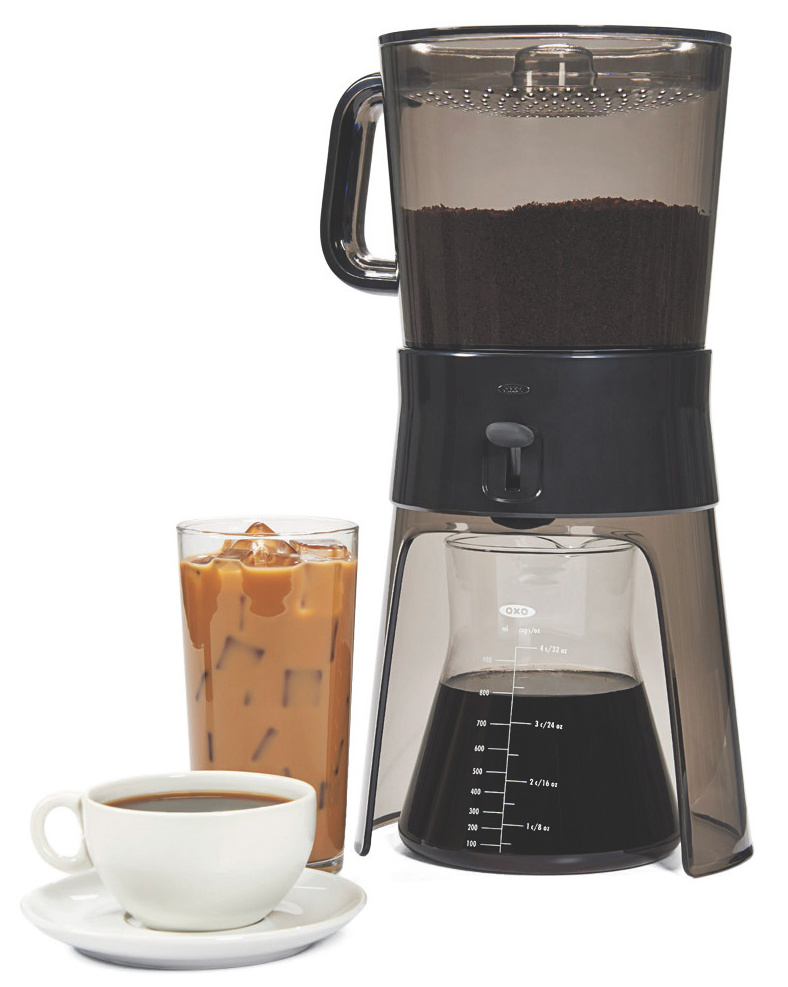 Der Haushaltswaren-Hersteller Oxo bietet mit dem Cold-Brew nun einen Kaffeebereiter mit einem feinmaschigen Edelstahl-Filter an. Ein gelochter Deckel sorgt außerdem dafür, dass der Aufguss nicht verklumpt.