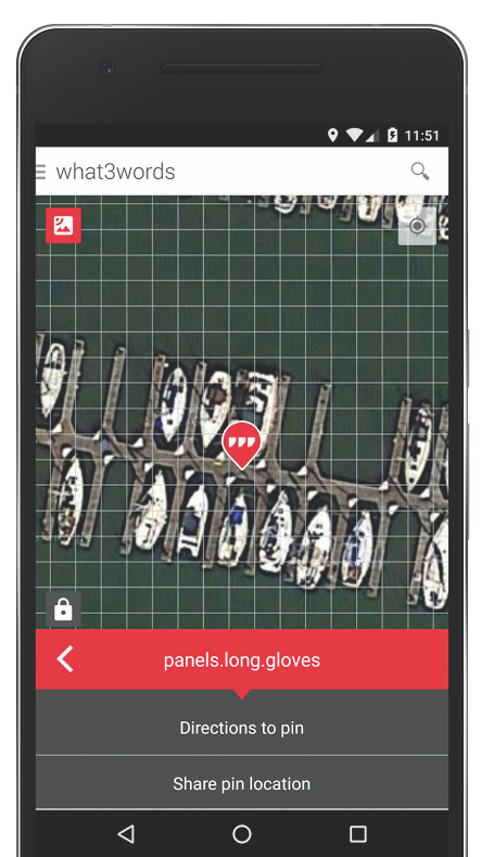 Die App selber funktioniert reibungslos und unspektakulär. Gibt man ein Wörter-Triplet ein, wandert ein großer roter Zeiger zum entsprechenden Quadrat. Man kann den Ort wie üblich teilen. Eine eigene Routing-Funktion besitzt die App nicht, stattdessen übergibt sie das Ziel an bereits installierte Navigationsanwendungen. Anders als auf der Webseite von What3Words arbeitet die App leider nur mit Google Maps und Satellitenbildern. Andere Karten wie Open Street Map fehlen. Schade, denn gerade deren größere Detailliertheit hätte gut zum engen Drei-Mal-Drei-Raster gepasst. GREGOR HONSEL