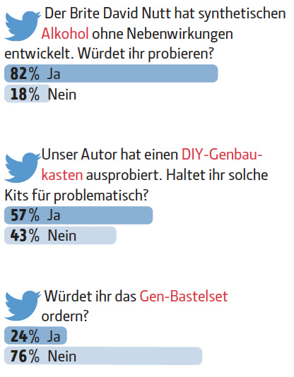 Ab sofort fragen wir unsere über 50000 Twitter-Follower regelmäßig zu Themen aus dem Magazin: Was meint ihr? Diesmal geht es um künstlichen Alkohol und ein Gen-Bastelset für Heimwerker.