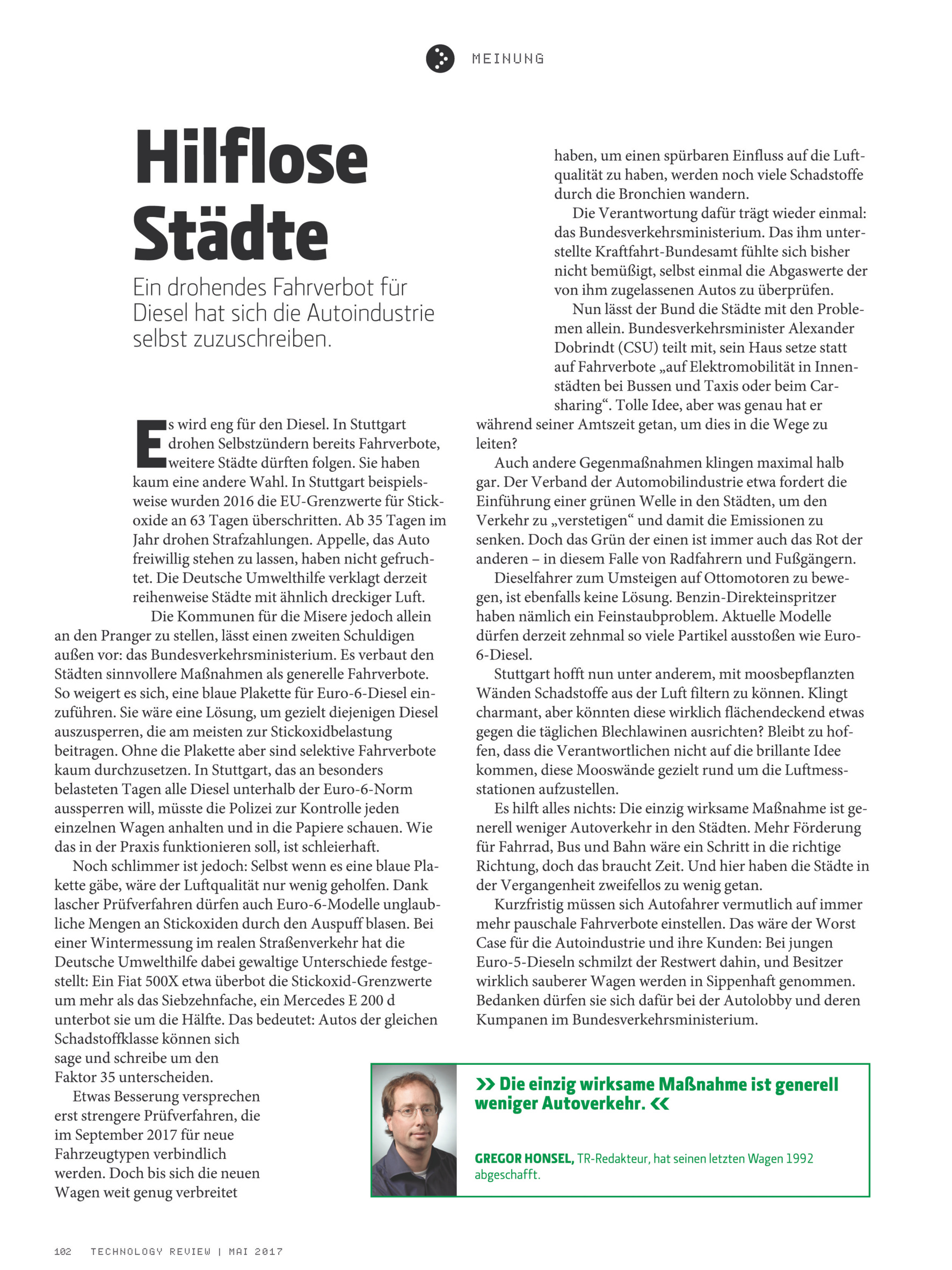In dem Beitrag geht es vorwiegend um die Belastung von Städten mit Stickoxiden. Das Problem Feinstaub sehe ich hier analog. Und das Ganze ist hausgemacht! Fahre ich durch deutsche Städte, erlebe ich immer wieder das Gleiche: rote Ampeln, und das auch auf den Hauptverkehrsadern. Ich stehe an einer roten Ampel, es wird Grün, ich fahre an und sehe Sekunden später, wie die nächste Ampel vor mir auf Rot umschaltet. Mein 1,6-LiterDiesel verbraucht bei 50 Kilometer pro Stunde nicht einmal 3 Liter pro 100 Kilometer. Durch das Stop and go pendelt sich meine Durchschnittsverbrauchsanzeige zwischen 6 und 8 Litern ein, mehr als doppelt so viel wie eigentlich notwendig. Bremsen und Anfahren verursachen darüber hinaus Abrieb an Kupplung, Bremsen und Reifen, der ebenfalls als Feinstaub durch die Städte weht. Mir geht es nicht darum, den Autofahrern länger Grün zu gewähren und Fußgänger und Radfahrer mit mehr Rot auszubremsen. Die Rot- und Grünzeiten wichtiger Ampeln sollen untereinander einfach nur besser koordiniert werden.