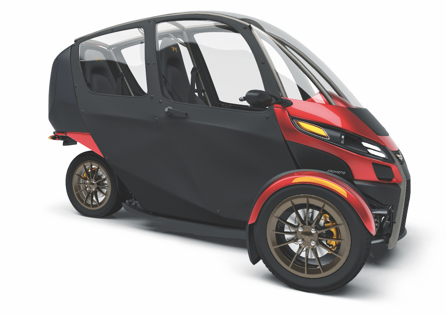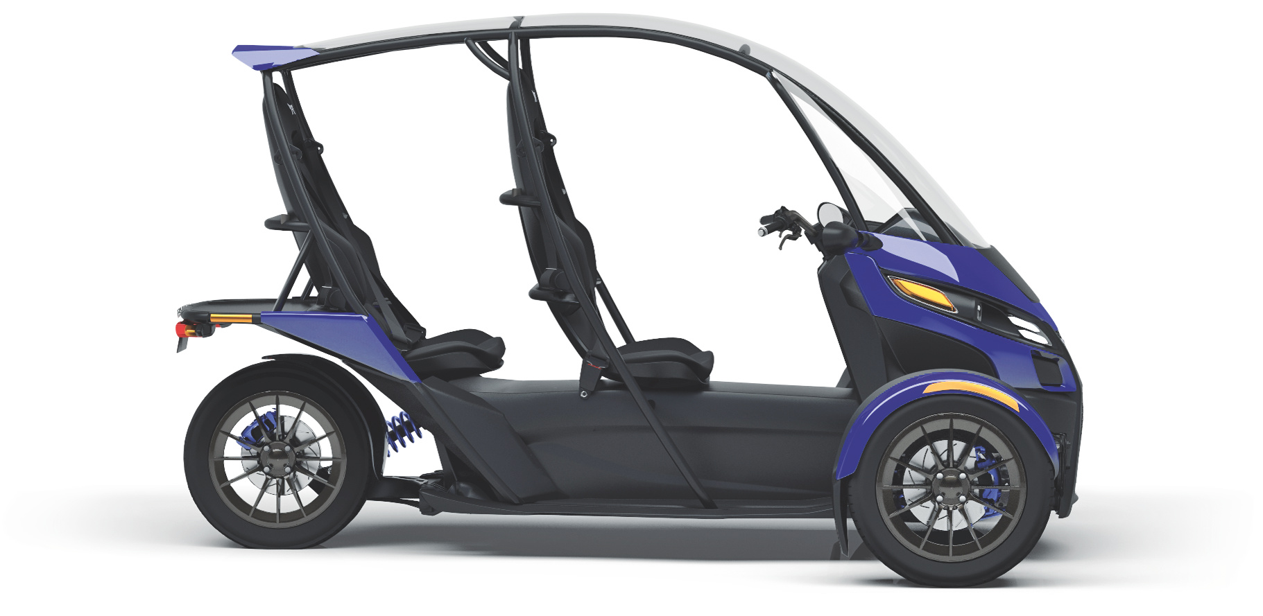 Mit einem Lenker wie bei einem Motorrad kommt das Elektrofahrzeug SRK daher. Obendrein kann sich das dreirädrige Gefährt wie ein Krad in die Kurven neigen. Angetrieben wird der wendige Zweisitzer des Start-ups Arcimoto aus Oregon von einem Elektromotor mit 67 PS. Je nach gewähltem Akku beträgt die Reichweite zwischen knapp 110 und 210 Kilometern. Dank des geringen Gewichts von 460 Kilogramm gelingt es dem SRK, in 7,5 Sekunden auf 60 Meilen in der Stunde (96,5 km/h) zu beschleunigen, die Höchstgeschwindigkeit liegt bei 135 Kilometern in der Stunde. Die Fahrerkabine ist ab Werk bis auf ein Regendach und eine Windschutzscheibe offen, es lassen sich allerdings Abdeckungen nachrüsten. Die Sitzplätze sind ebenfalls wie bei einem Motorrad hintereinander angeordnet. Trotzdem betrachten die Entwickler den SRK nicht als reines Freizeitgefährt. Ihr Dreirad soll alltagstauglich sein und hält deshalb auch Versionen mit Stauraum für Einkäufe bereit. Für das Modell „Deliverator“ wird zudem an einer vollverkleideten Version ohne Rücksitz gearbeitet – ideal für Bringdienste.