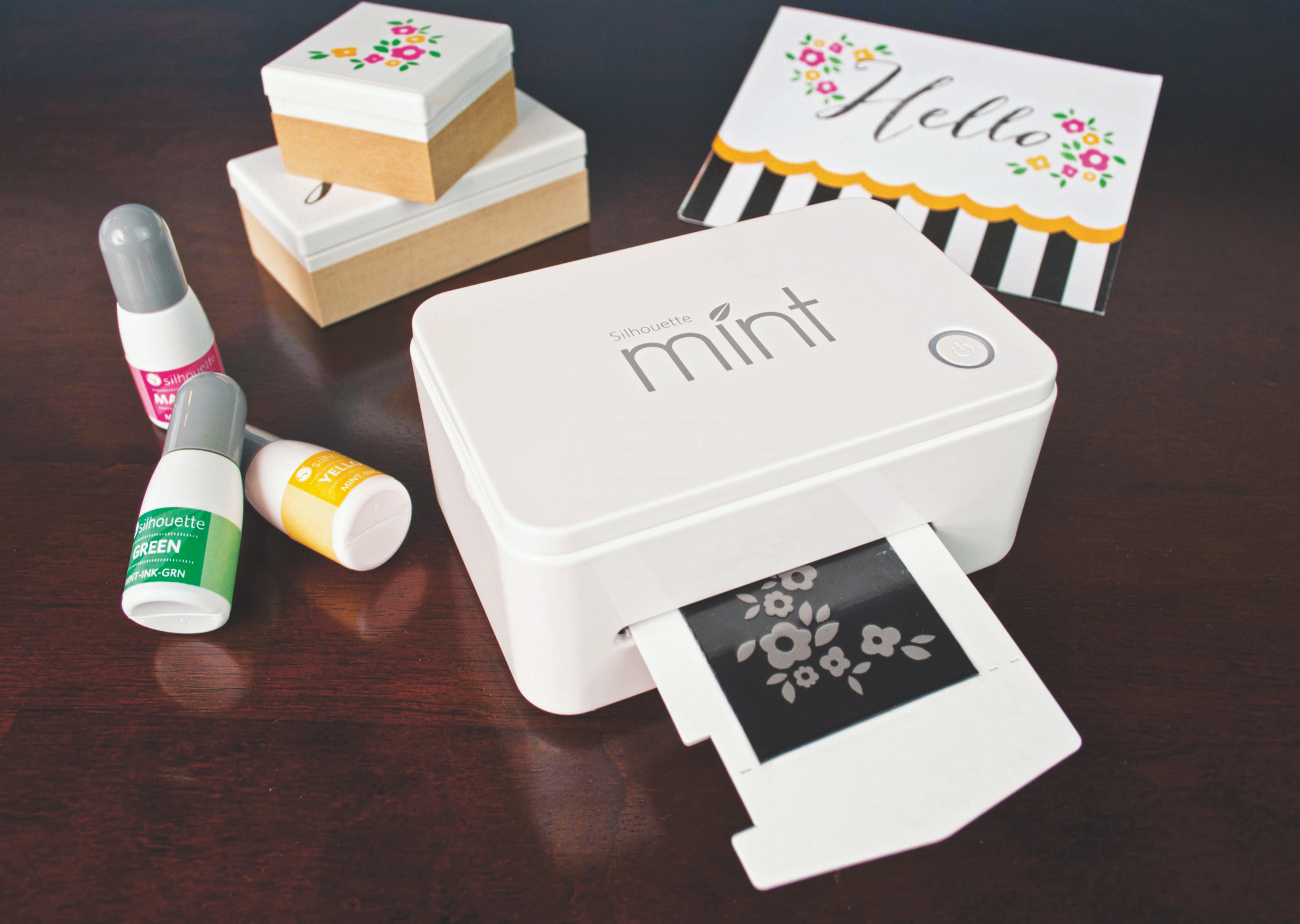 Wer einen Stempel benötigt, um Briefe, Karten oder Bilder zu verzieren, muss nicht mehr zu Kartoffel und Messer greifen oder eine „Mr. Minit“-Filiale aufsuchen. Die handliche Maschine Mint von Silhouette druckt selbst designte Stempelunikate aus und schneidet sie auch zu. Bei den Entwürfen für die Stempel unterstützt die beiliegende PC-Software, die zum Beispiel auch das Rastern von Digitalfotos erlaubt. Der Mint-Shop bietet ebenfalls Vorlagen an. Es ist möglich, die Stempel in mehreren Farben zu kolorieren und somit Alben oder Karten farbig zu bedrucken. Stempelfarbe in Rot, Blau, Gelb und Schwarz gehört zum Set. Insgesamt sind 18 Farben erhältlich. Das Material lässt sich nachkaufen.