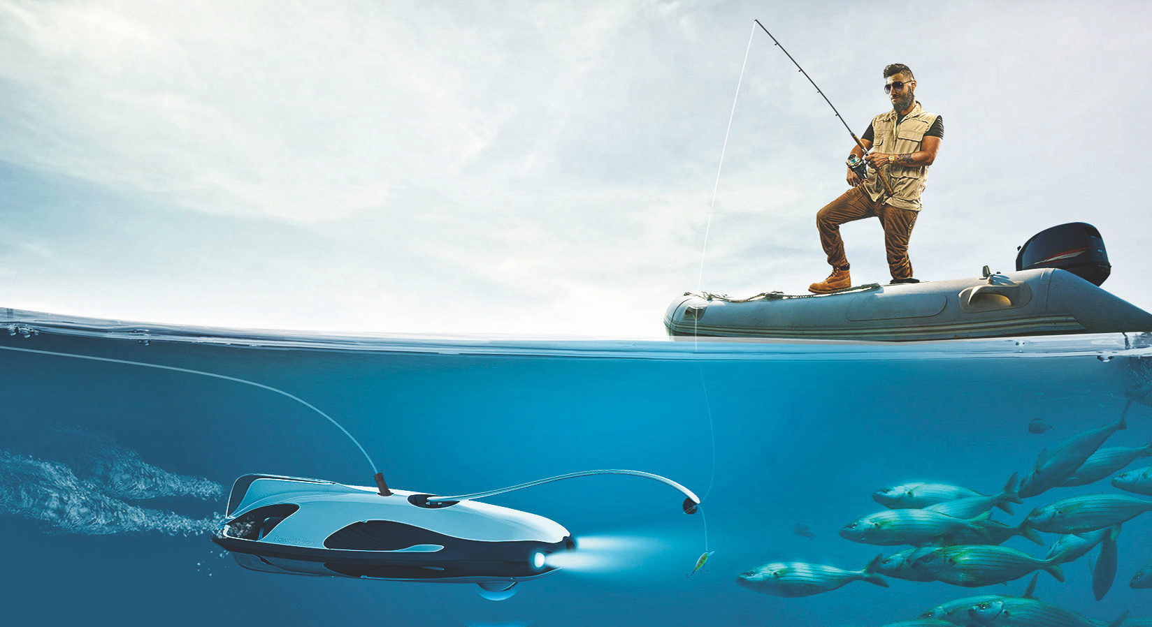 Angler wissen gern, wo die meisten Fische schwimmen. Für sie gibt es nun PowerRay. Die Schwimmdrohne des amerikanisch-asiatischen Unternehmens PowerVision verfügt über ein Echolot, das beim Auffinden von Fischschwärmen hilft. Obendrein ist das System mit einer 4K-Ultra-HD-Kamera sowie einem speziellen blauen LED-Licht ausgestattet. Mit dem zurüstbaren PowerSeeker kann man über eine App die Beschaffenheit der Unterwasserwelt bis hin zur Temperatur erkunden. Bei ihren Tauchgängen in maximal 30 Metern Tiefe bleibt die Drohne allerdings per Datenkabel mit dem Land oder dem Boot verbunden. Geht der Kontakt verloren, taucht das Gerät automatisch auf. Soll gefischt werden, kann der PowerRay eine an seinem Ausleger befestigte Angelschnur samt Köder gezielt in die Nähe der Tiere bringen. Die maximale Einsatzzeit der Drohne beträgt durch den Akku vier Stunden, dabei kann sie bis zu zwei Meter pro Sekunde zurücklegen. Wer sich eher für Bilder interessiert, kann das Gerät mit einer VR-Brille nutzen.