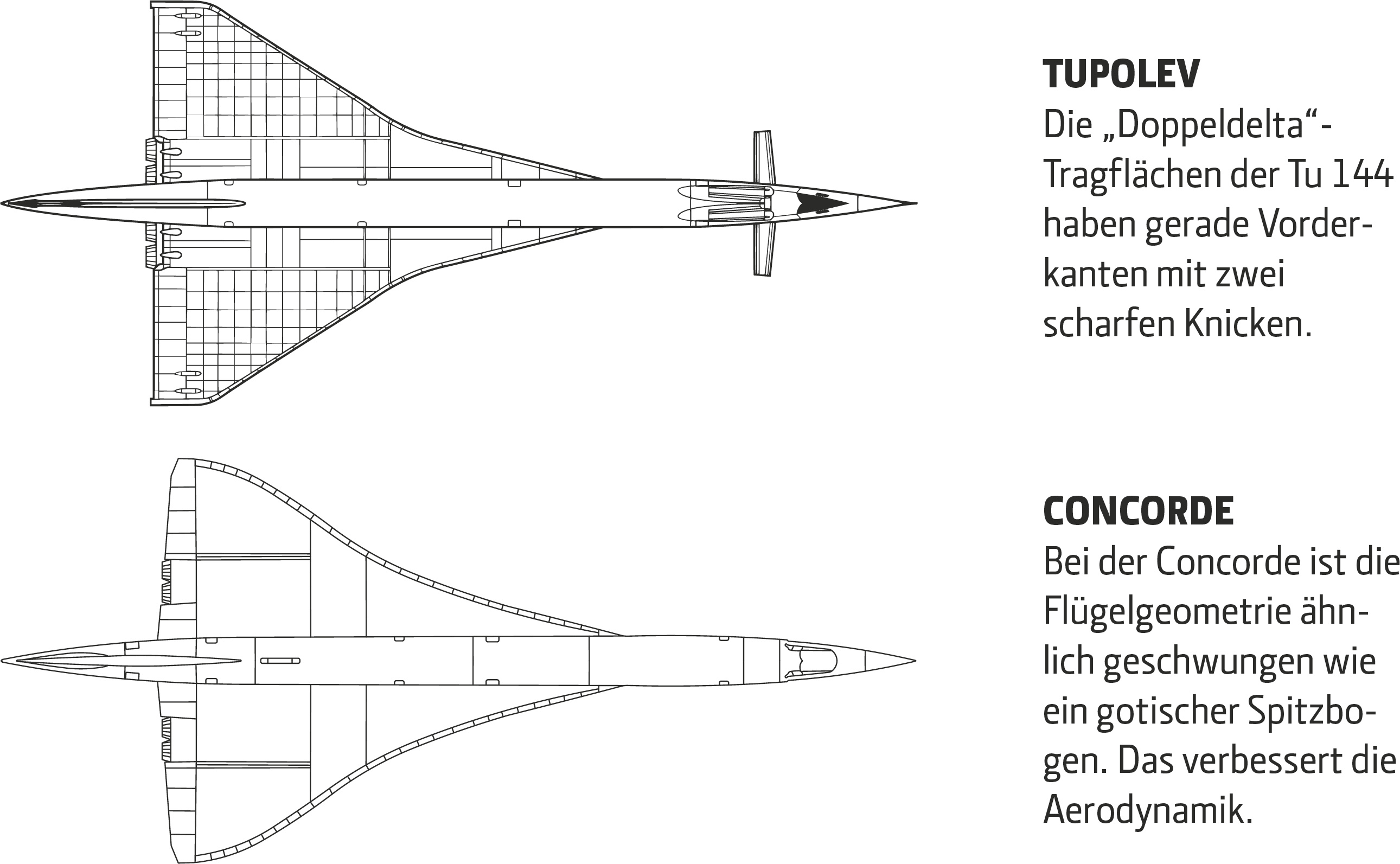 Auf den ersten Blick ähneln sich Tupolew Tu 144 und Concorde wie ein Ei dem anderen. Trotzdem haben die beiden Überschall-Verkehrsflugzeuge einen völlig unterschiedlichen Werdegang: Die Karriere der Concorde endete bekanntlich im Jahr 2000 mit einem Crash. Die der Tupolew begann mit einem.