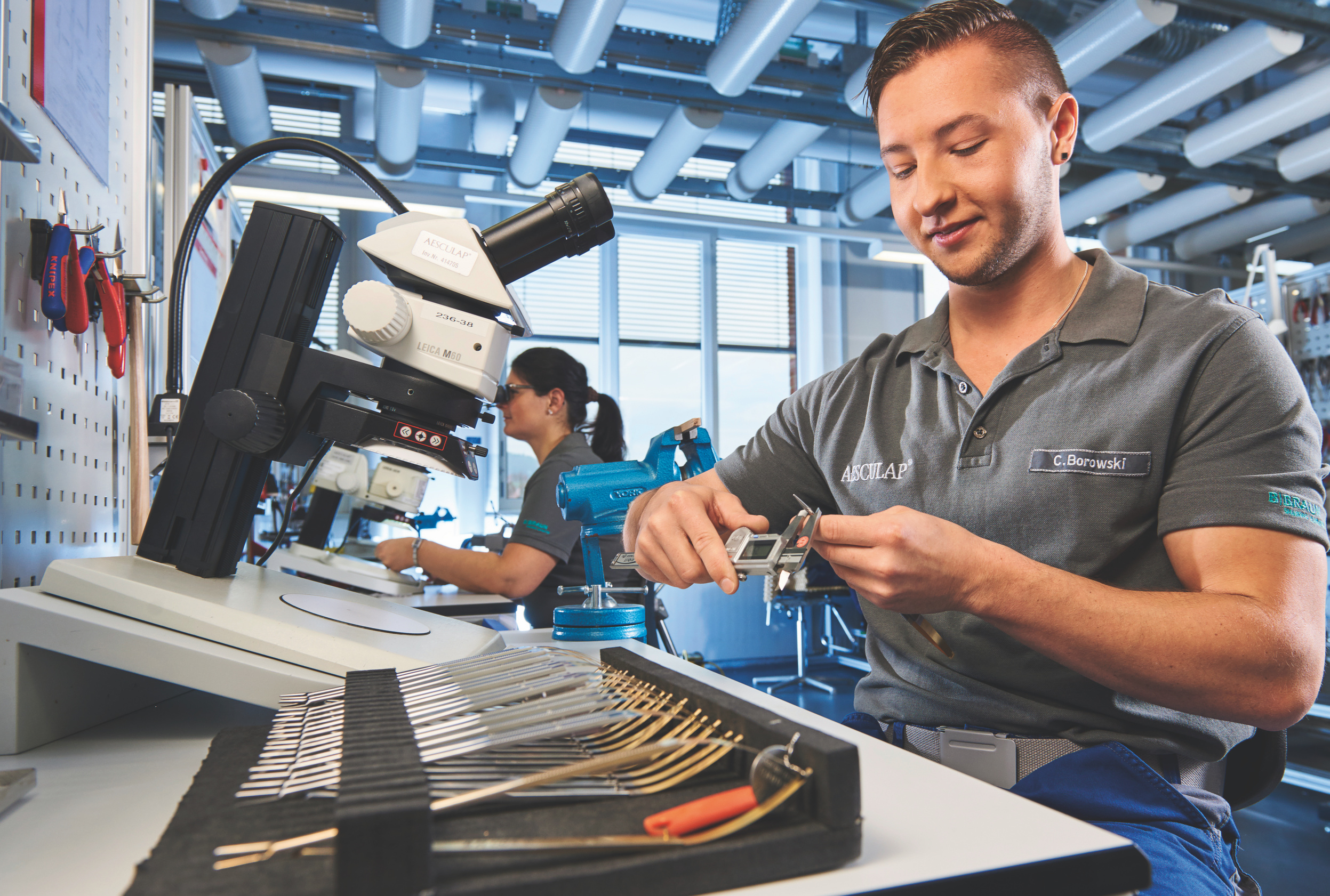 Chirurgiemechaniker sind für die Entwicklung neuer Instrumente gefragt. „Es ist die Synthese aus moderner Fertigungstechnik und unserem handwerklichen Geschick, das letztendlich ein qualitativ hochwertiges Produkt ausmacht“, sagt Christian Borowski von der Aesculap AG. Der 26-Jährige leitet dort eine sechzig Mann große Werkstatt und fertigt neben Sägen, Nadelhaltern, Pinzetten, Skalpellen und Arterienklemmen auch Prothesen und Implantate. Dazu erstellt Borowski mithilfe eines CAM-Systems (Computer Aided Manufacturing) die Bauanleitung für Hüftgelenke und andere Implantate. Daraus entstehen an CNC-Dreh- und Fräsmaschinen zunächst sogenannte Halbzeuge, also halb fertige Produkte. „Ich stelle aus diesen vorgefertigten Teilen hochpräzise und qualitativ anspruchsvolle Instrumente her“, erklärt Borowski.