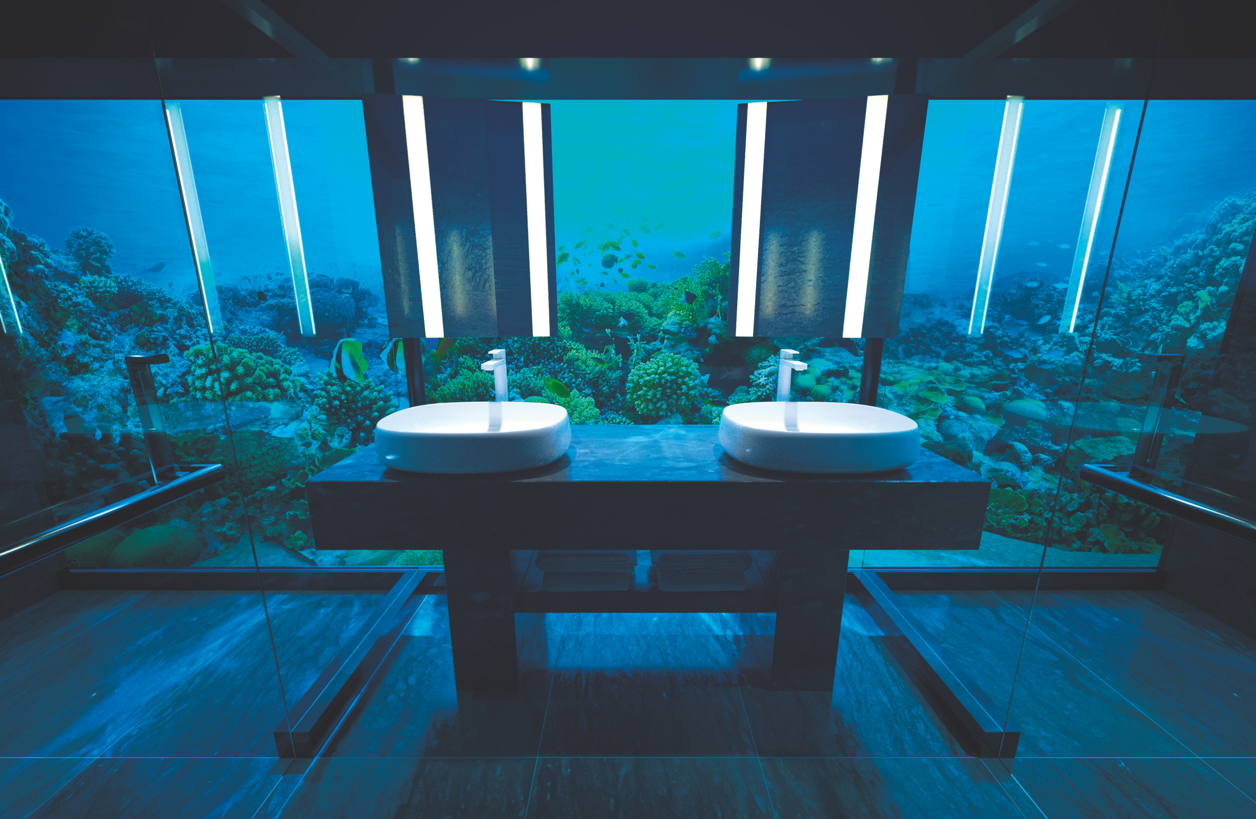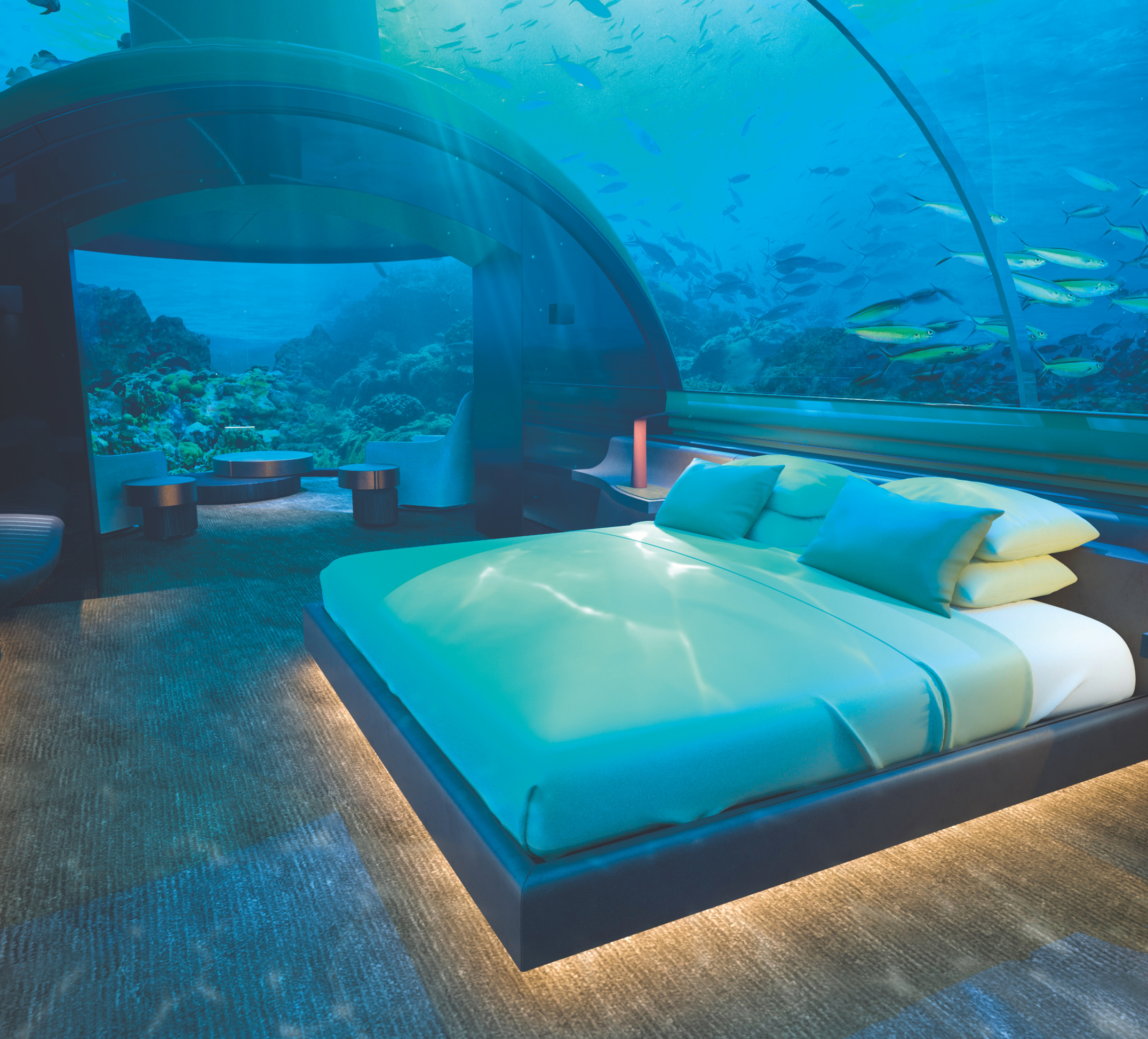 Wer schon immer mal eine Nacht auf dem Meeresgrund verbringen wollte, hat dazu jetzt auf den Malediven Gelegenheit – Liquidität vorausgesetzt. Das „Hilton's Conrad Maldives Rangali Island“ hat im November die Hotelvilla „The Muraka“ eröffnet, die auf den ersten Blick aussieht wie viele Wasserbungalows auf den Malediven – im türkisfarbenen, seichten Wasser gelegen und über einen langen Steg erreichbar. Allerdings hat The Muraka, was so viel wie Koralle heißt, als erste Hotelvilla weltweit ein Untergeschoss in gut fünf Metern Tiefe. Dort befinden sich unter einem gläsernen Gewölbe ein kleiner Wohnraum mit Blick auf ein Korallenriff, ein Schlaf- und ein Badezimmer. Das Untergeschoss wiegt 600 Tonnen, wurde in Singapur gebaut und mit dem Schiff zu den Malediven gebracht. Laut Bloomberg hat der komplette Wasserbungalow rund 15 Millionen Dollar gekostet.