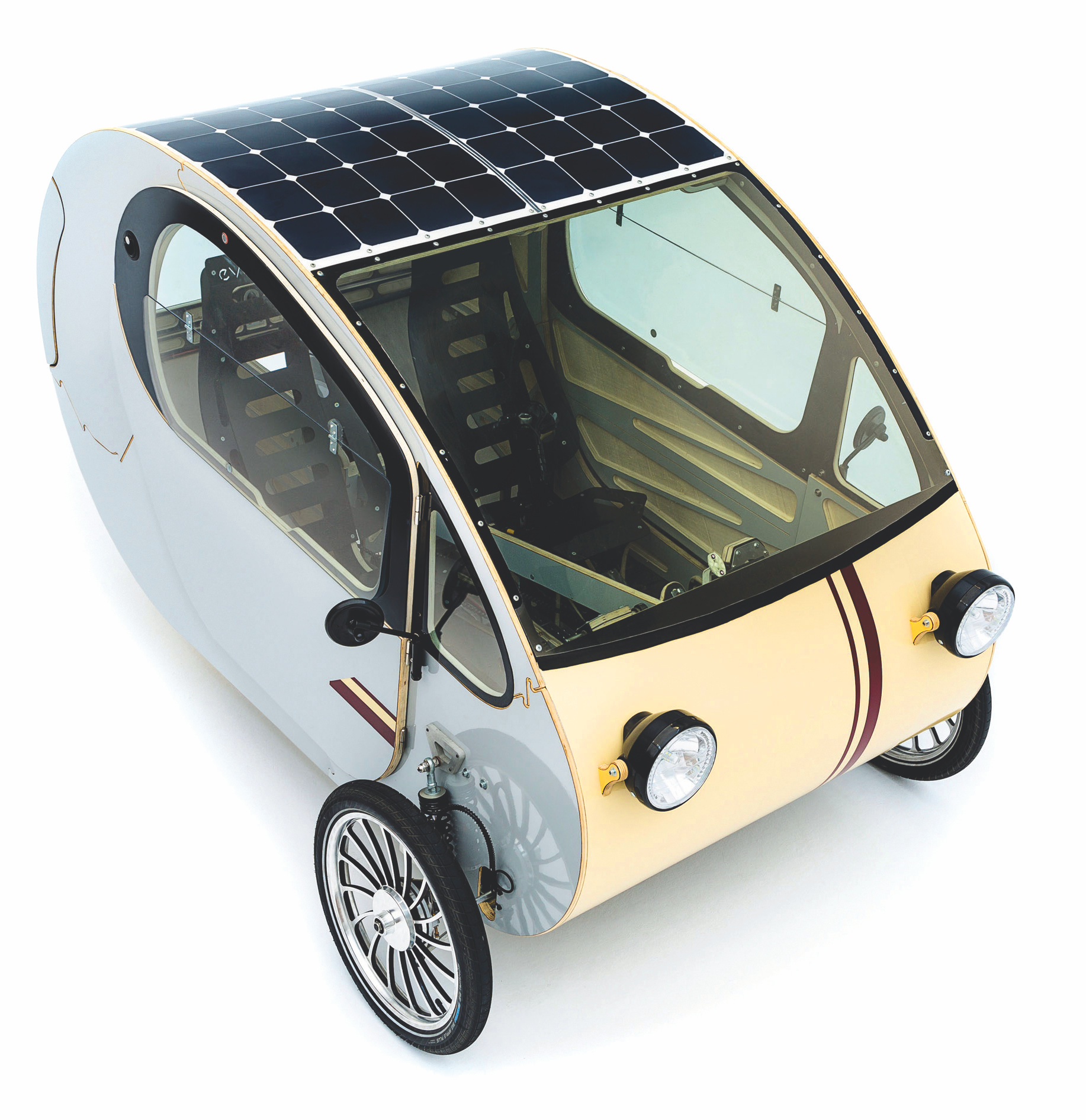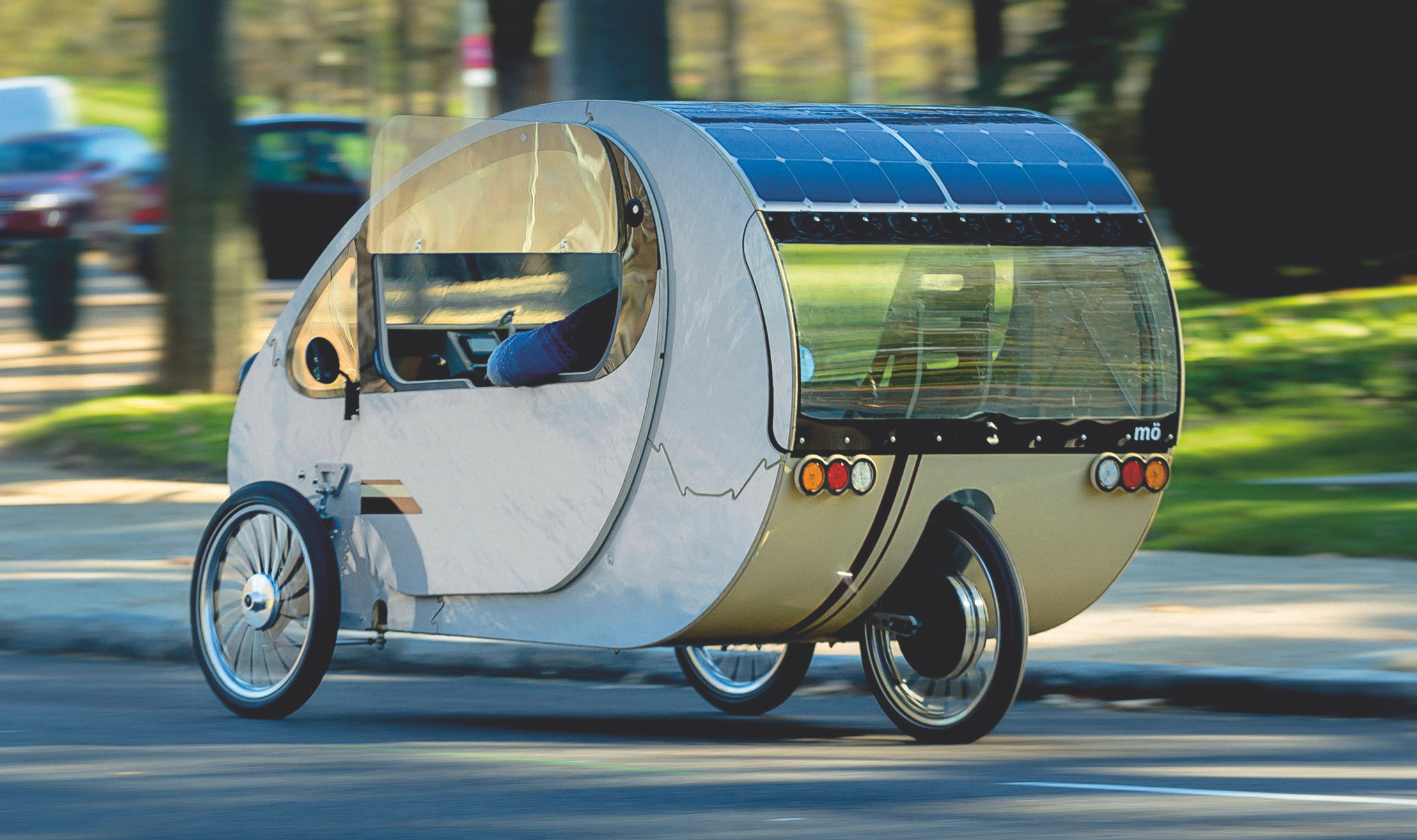 Zwei Sitze, drei Räder, vier Pedale – das Konzept des spanischen Elektrodreirads mö erinnert an den Klassiker Twike, allerdings in einer deutlich abgespeckten Version: Es kostet mit rund 5000 Euro nur einen Bruchteil des Twike, ist mit 45 km/h aber auch deutlich langsamer. Dafür besitzt es ein Solarpanel mit 200 Watt Leistung, das nach einer Stunde in der Sonne genug Energie für fünf bis zehn Kilometer liefern soll.