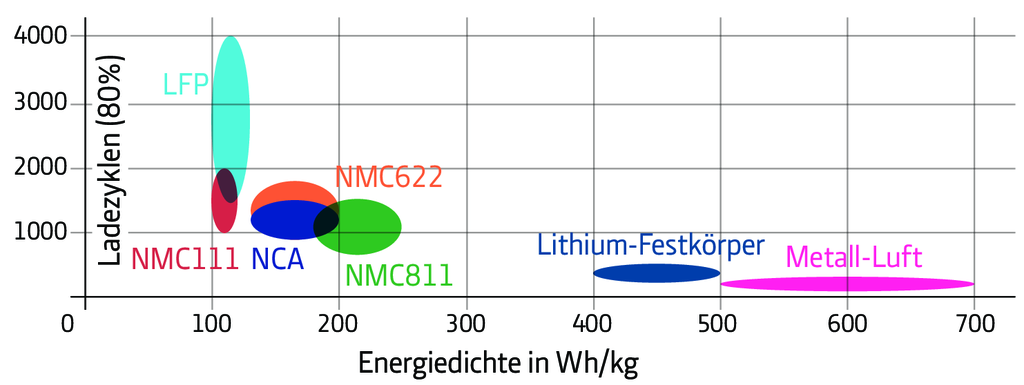 Akkus mit verschiedenen Anteilen an Nickel (N), Mangan (M) und Kobalt (C) dominieren den Markt (NMC111, NMC622, NMC811). Tesla nutzt Varianten aus Nickel, Kobalt und Aluminiumoxid (NCA), die unter anderem eine gute Schnellladefähigkeit haben. Lithium-Eisenphosphat (LFP) ist günstig und robust (gemessen an Ladezyklen bis Erreichen von 80 Prozent Kapazität), eignet sich wegen relativ geringer Energiedichte aber eher für Heimspeicher. Das Gegenteil gilt für Festkörper- und Metall-Luft-Akkus.