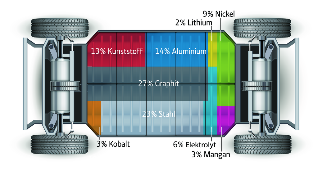 Etwa 360 Kilogramm bringt eine State-of-the-Art-Batterie des Typs NMC622 mit einer Kapazität von 40 Kilowattstunden auf die Waage. Sie besteht im Wesentlichen aus neun Komponenten, den größten Gewichtsanteil davon macht Graphit mit 27 Prozent aus. Ein Großteil des Materials lässt sich bereits heute gut recyceln. Neue Verfahren für die Rückgewinnung des Lithiums und der teils flüssigen Elektrolyte stehen in der Entwicklung, um einen geschlossenen Stoffkreislauf zu erreichen (siehe TR 7/2019, S. 28).