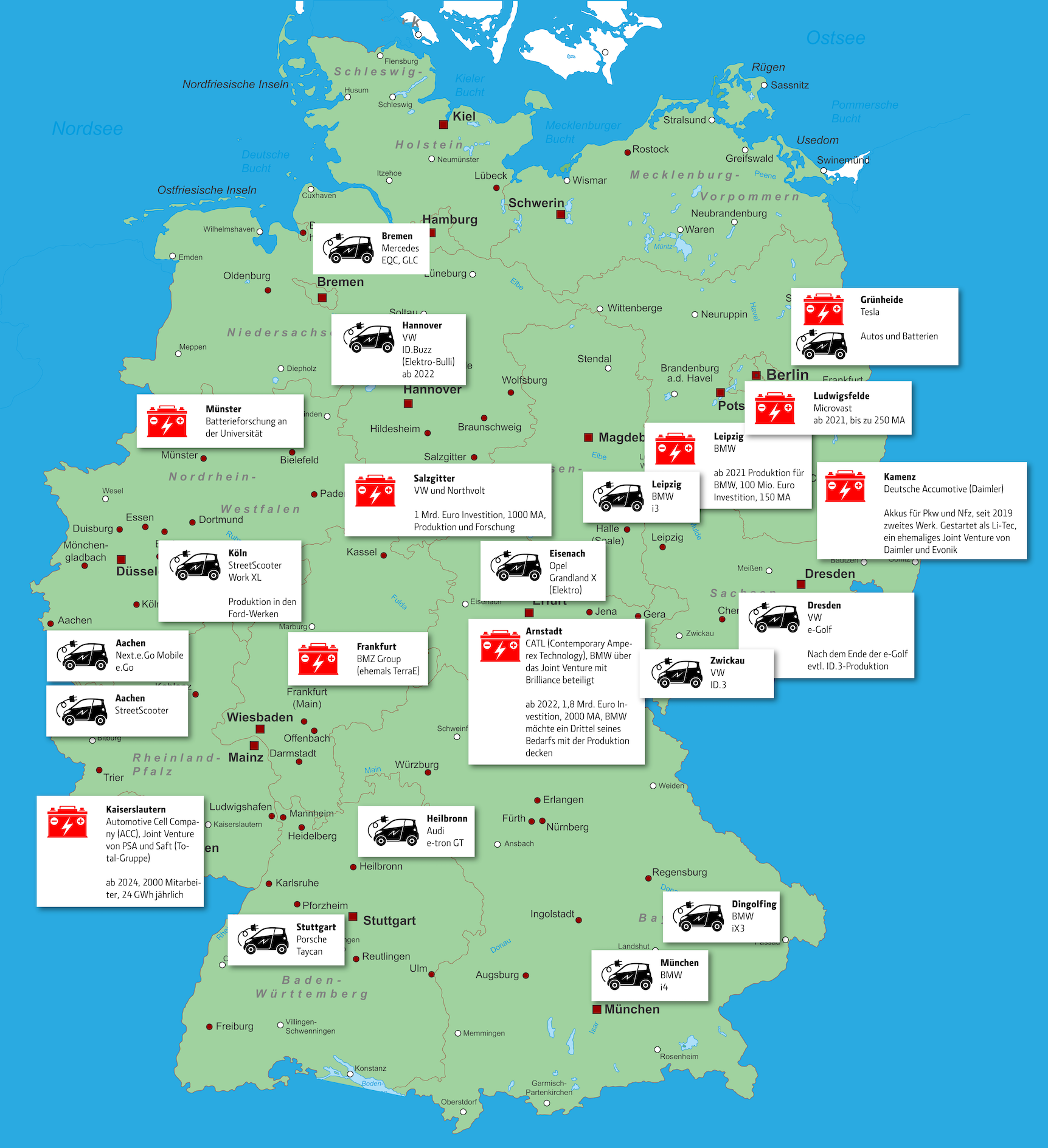 In gut 20 Fabriken in Deutschland werden bereits Elektroautos und Batterien hergestellt, oder gehen demnächst in Produktion. Wir geben einen Überblick, wo die Autos von morgen gefertigt werden.