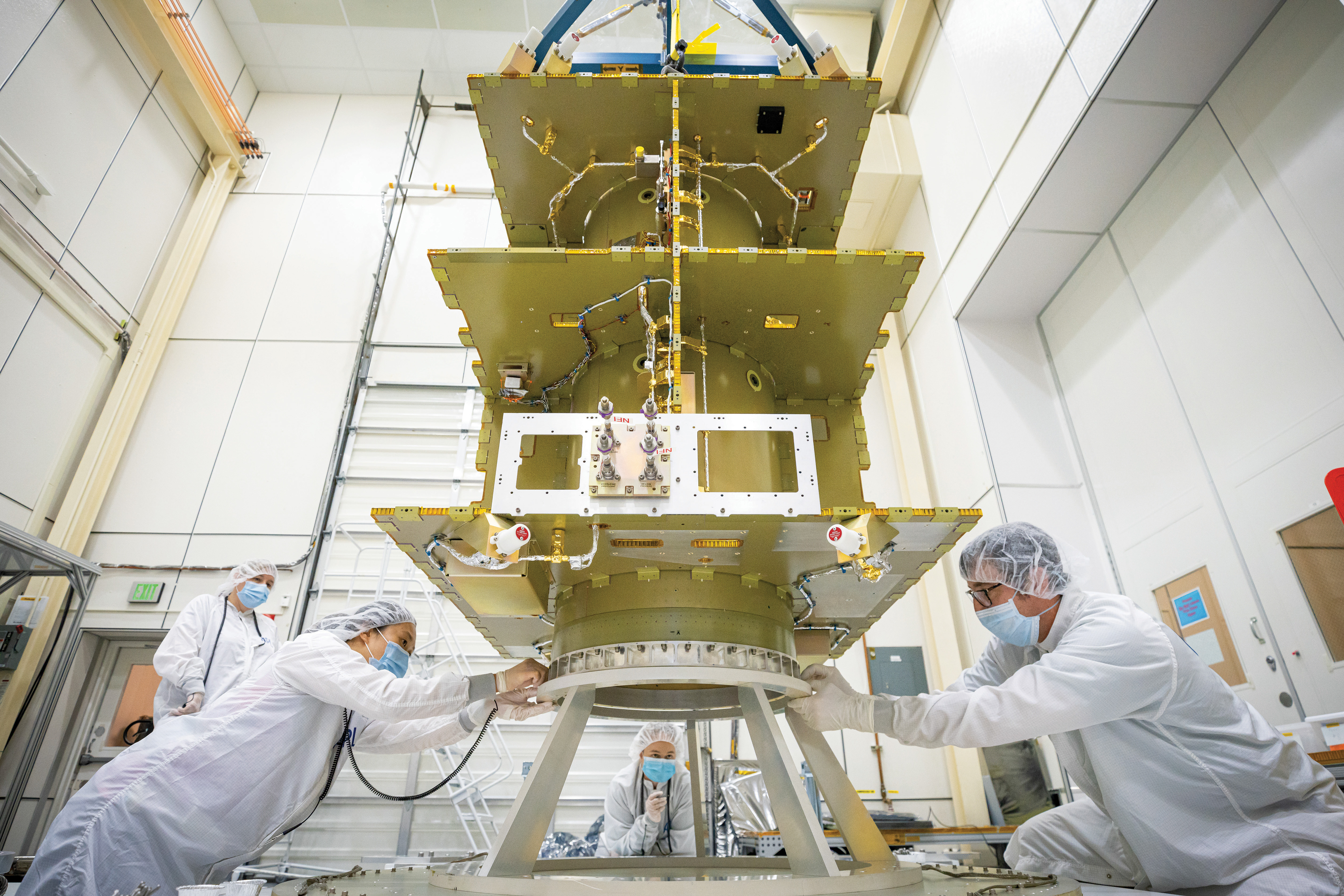 In einem Reinraum in Gebäude 23 des Laboratoriums für angewandte Physik der Johns Hopkins University in Laurel, Maryland, hängt die Dart-Sonde wie ein zerbrochenes kubistisches Ei. Gerade wird der Star Tracker für die Positionsbestimmung im All am Kern montiert. Das Avioniksystem, der Zentralcomputer von Dart, hängt gut sichtbar an quadratischen Paneelen. Sie bilden die Seiten, sobald das Raumfahrzeug zusammengeklappt ist. Gyroskope und Antennen sind freigelegt. In einem Raum nebenan wartet das experimentelle Antriebssystem namens Next-C. Große Bündel dicker, mit silberner Isolierung umwickelter Kabel hängen wie Ranken von der Raumsonde herunter und laufen am Boden entlang zum Kontrollraum. Dort sind sie mit einer gewaltigen Batterie von Testcomputern verbunden, die vier Ingenieure bedienen.