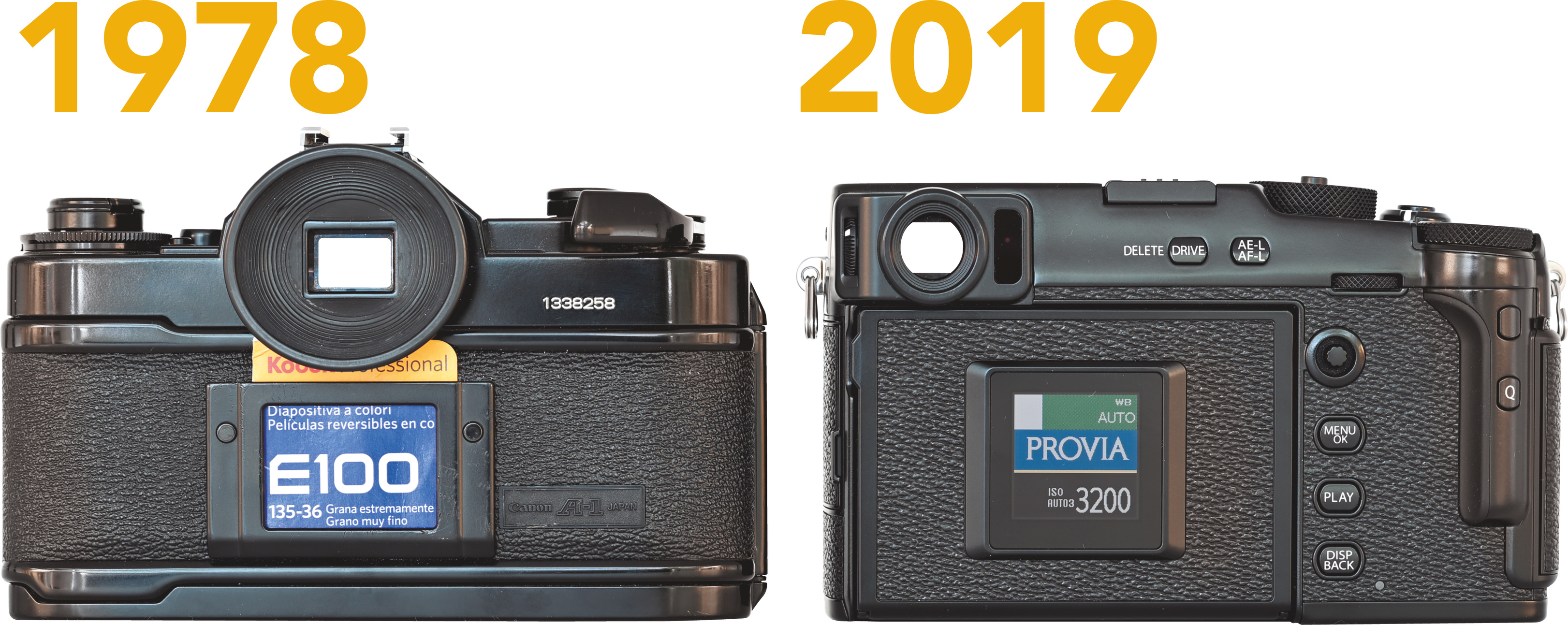 Gut, dass sie die Zeit in der Redaktion fĂĽr dieses Vergleichsfoto ĂĽberdauert hat: Die Canon EOS A-1 von 1978 hatte eine Memohalterung fĂĽr die Lasche der Filmverpackung. Die Fujifilm X-Pro 3 ahmt dieses Bauteil aus analogen Zeiten nun nach.
