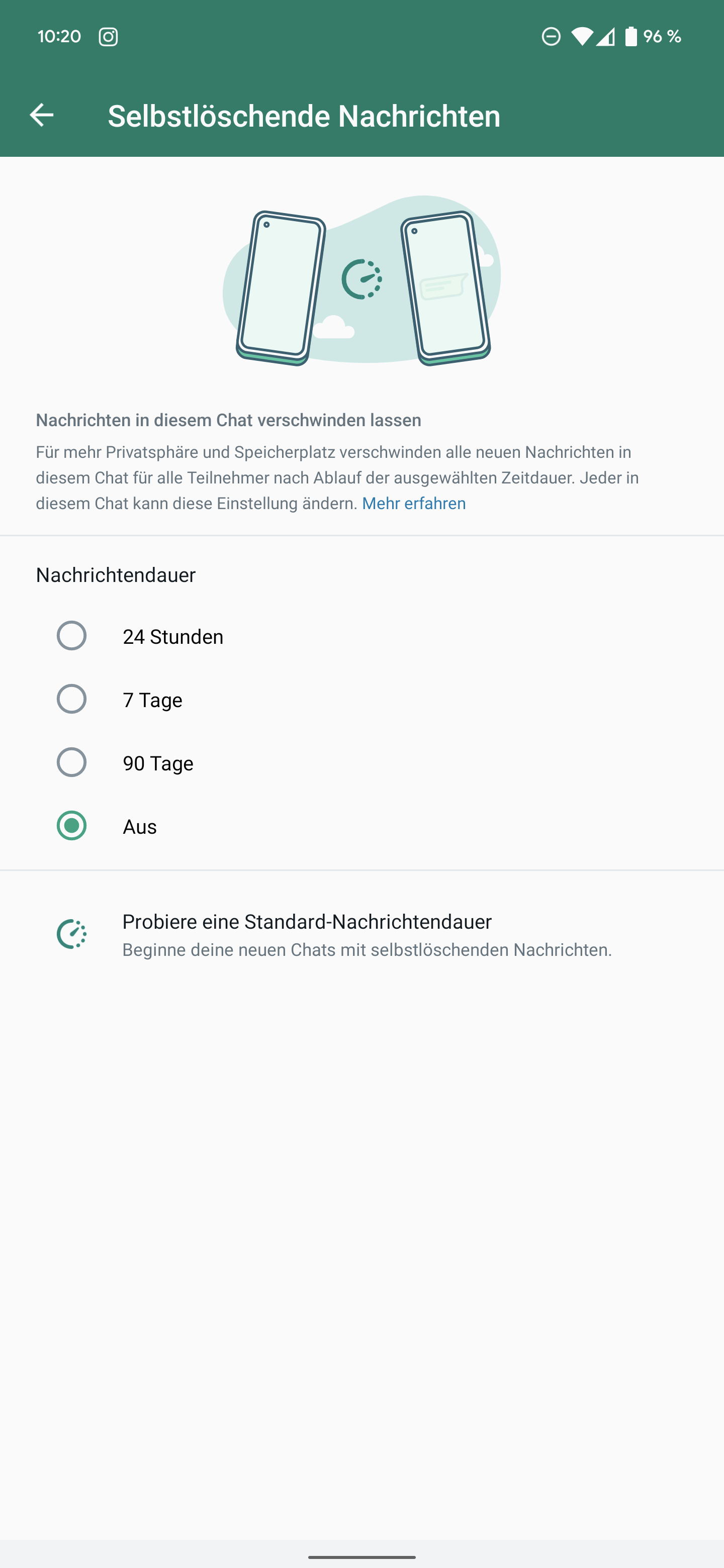 WhatsApp bietet eine Einstellung, mit der alle zukünftigen Nachrichten in einem bestimmten Chat nach sieben Tagen automatisch von Ihrem Telefon gelöscht werden. Seien Sie sich jedoch bewusst, dass dies nicht bedeutet, dass jemand in der Zwischenzeit keinen Screenshot gemacht oder Nachrichten geteilt hat. Außerdem würden wir nicht empfehlen, diese Funktion für den Nachrichtenverlauf mit Ihren Liebsten zu aktivieren - sie kann aber nützlich sein, um aktiviere Chats überschaubar zu halten. Wie Sie WhatsApp-Nachrichten automatisch löschen lassen, können Sie hier nachlesen.