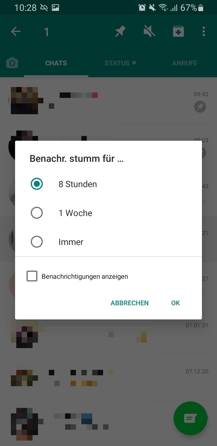 Zum Glück können Sie Chats einfach stumm schalten. Markieren Sie den entsprechenden Chat und wählen Sie dann das durchgestrichene Lautsprechersymbol aus. Auf dem iPhone wischen Sie den Chat einfach nach links und finden dann im Menü "Mehr" die Option "Lautlos". Sie können dann eine Dauer für die Stummschaltung auswählen, von "8 Stunden" bis hin zu "immer".