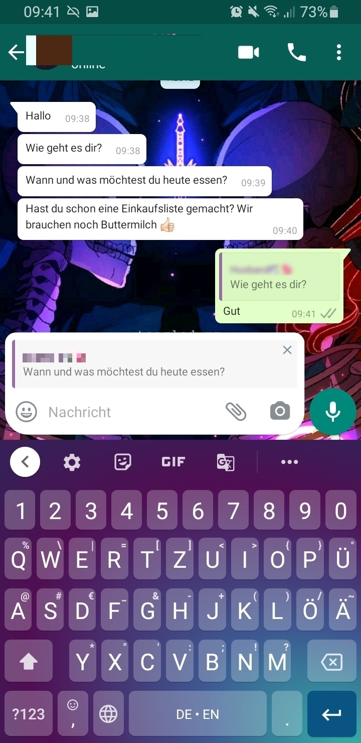 Dadurch wird die ursprüngliche Nachricht mit Ihrer Antwort darunter am unteren Rand Ihres Chat-Bildschirms angezeigt. Drücken Sie dazu so lange auf die Nachricht, bis ein Menü erscheint, aus dem Sie "Antworten" auswählen können. Alternativ und schneller geht es, wenn Sie einfach von links nach rechts über die Nachricht wischen, auf die Sie antworten möchten. Dies geht auch mit Ihren eigenen Nachrichten.